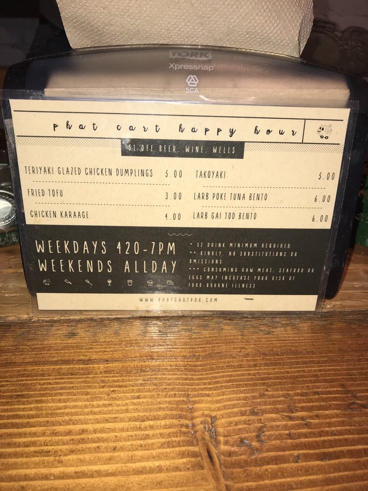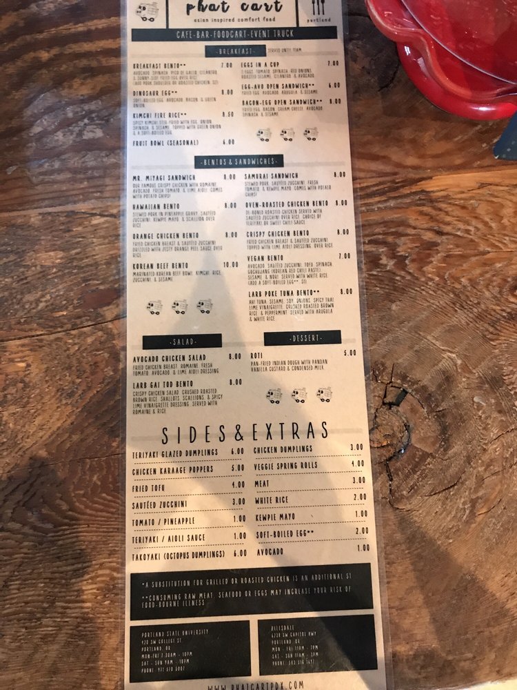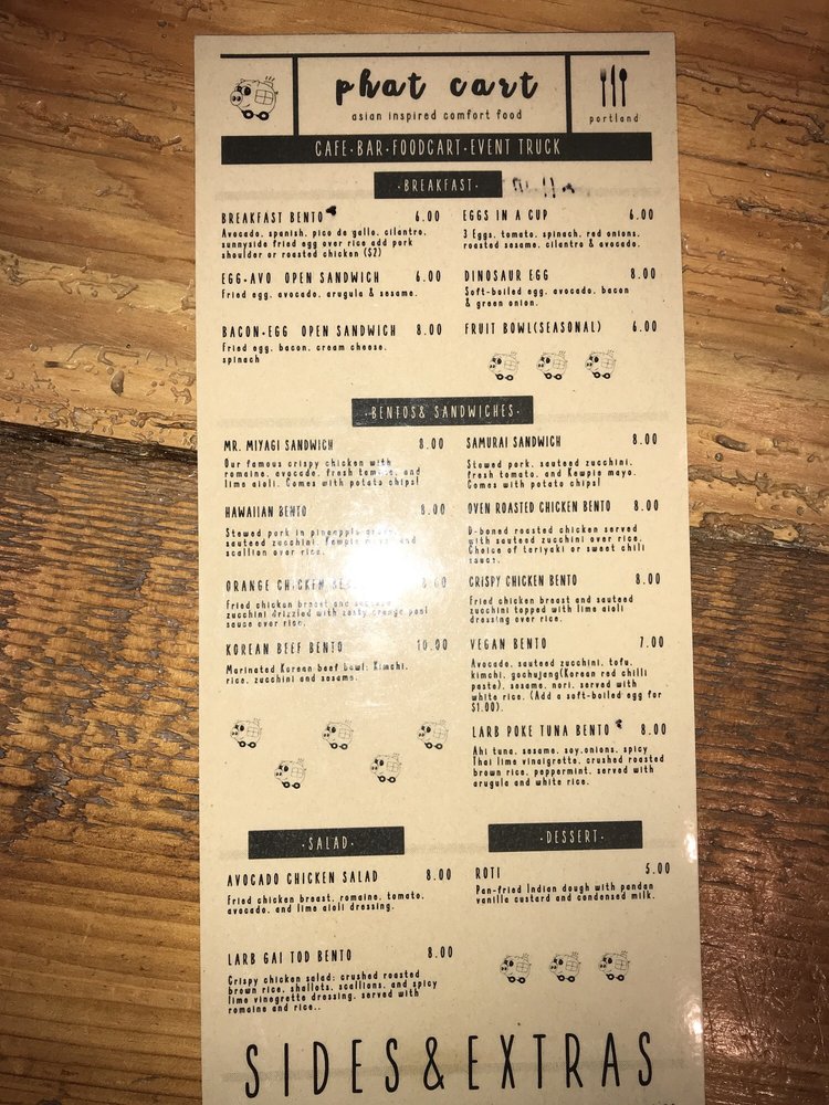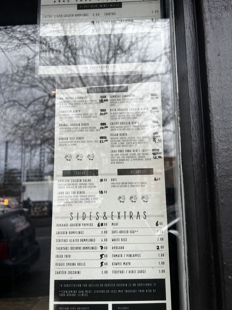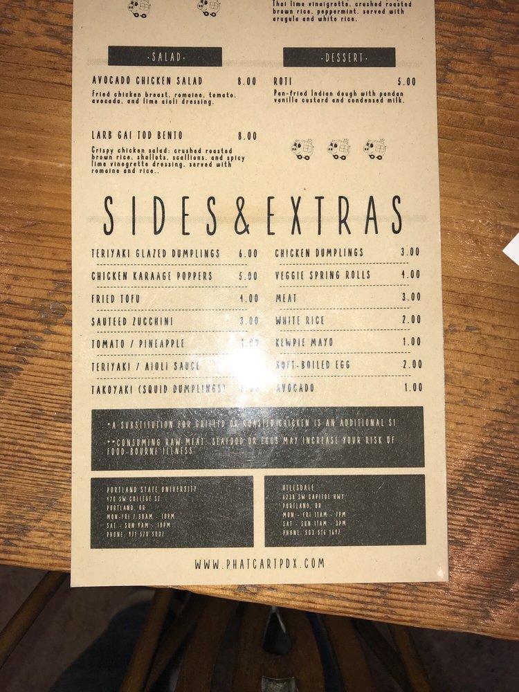 Phat Cart, located in Portland, offers a unique dining experience with a menu full of diverse options. From crispy chicken bento to Hawaiian pork bento, the dishes are flavorful and well-priced. The desserts, like the Roti and GingerPeach White Velvet Cake, are a must-try for those with a sweet tooth. With fresh produce available and a range of vegan and vegetarian options, Phat Cart caters to a variety of dietary preferences. Customer reviews rave about the cozy ambiance and friendly staff, making it a great place for students and friends to gather. Don't miss out on trying the Korean short rib bowl or the JalapeƱo Gyudon for a taste of something truly special. Overall, Phat Cart is a trendy, intimate spot with delicious food and excellent service.